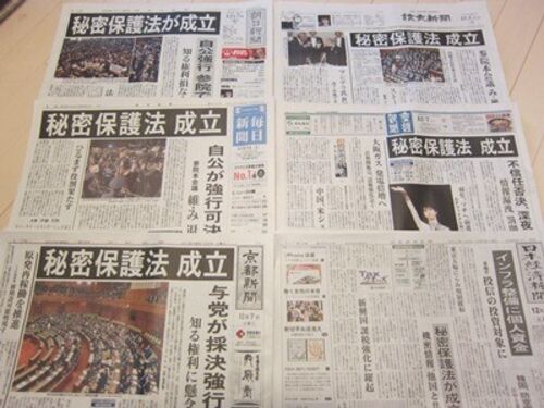 特定秘密保護法が6日夜、参院で採決強行、可決され成立したことに対し、わたしが身を置く関西で新聞各紙がどのように報じたか、朝日、毎日、読売、産経、日経の全国紙5紙(いずれも大阪本社発行の最終版)と京都新聞の7日付朝刊紙面を点検しました。各面…