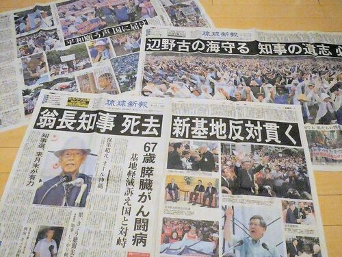8月8日に死去した沖縄県知事、翁長雄志氏を沖縄県外、日本本土の新聞も社説や論説で取り上げています。 全国紙では朝日新聞、毎日新聞、読売新聞がそろって8月10日付で、産経新聞(「主張」)が11日付で掲載しました。普天間飛行場の辺野古移設を巡っ…